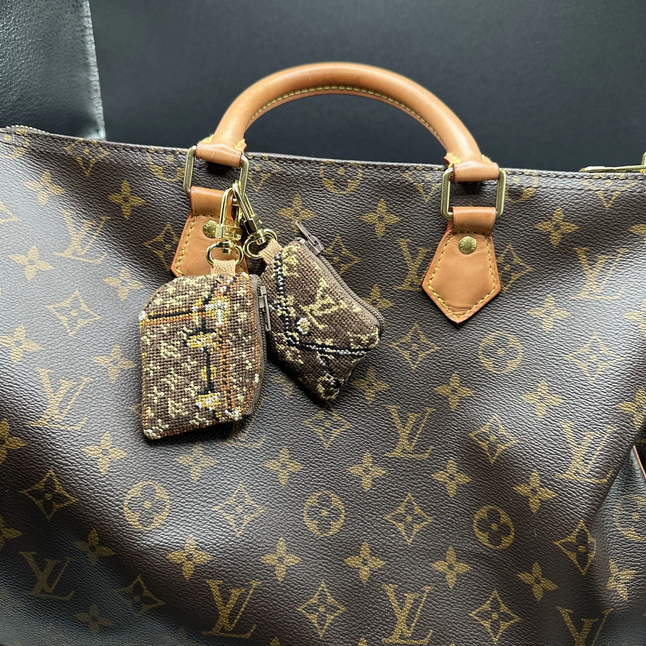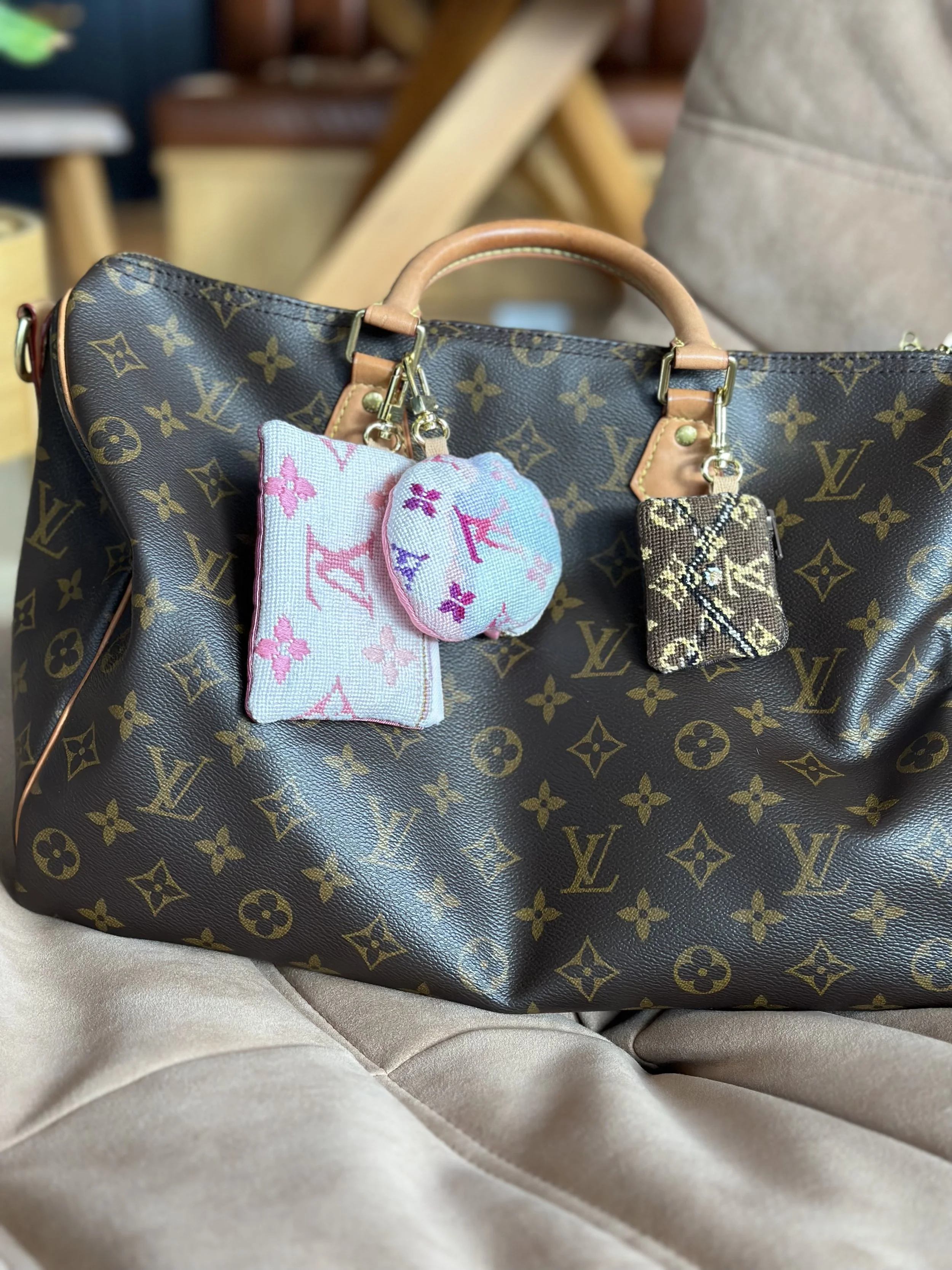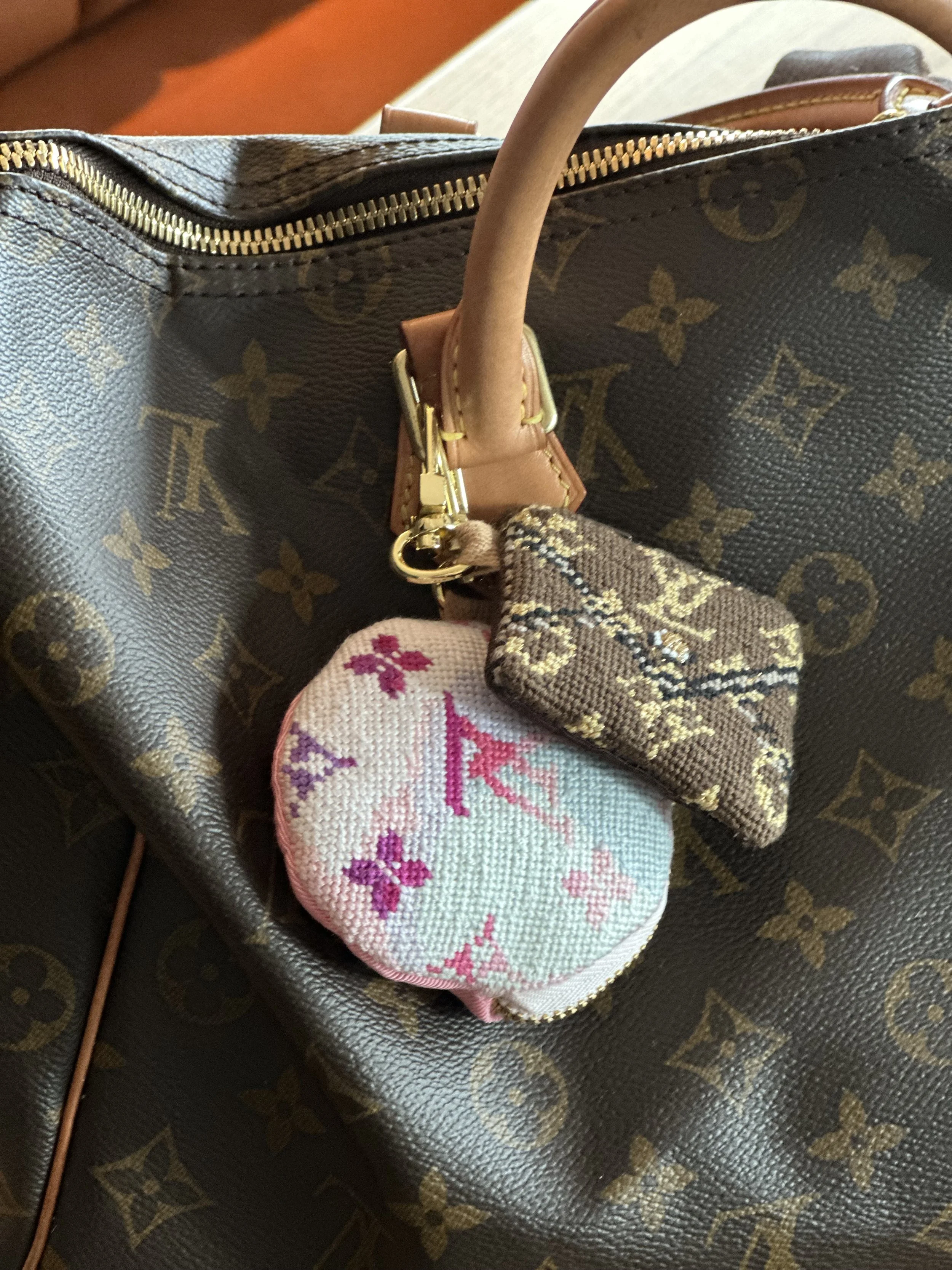These make the cutest bag charms or key fobs finished with a zipper and a clip - a place to store your keys, ear buds, lipstick and mirror, extra needlepoint needles, scissors and threaders…anything you can dream of you can stash in these! There are so many fun places to hang these cuties from but they can also make perfect ornaments or door hangs for the luxury handbag lover in your life or a gift to yourself!